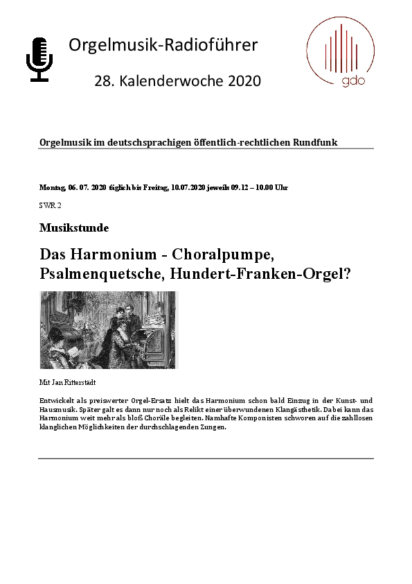 Allen, die sich für Orgelmusik und Harmoniummusik interessieren, sei der gut kuratierte, wöchentlich als PDF-Datei erscheinende Orgelmusik-Radioführer der GdO wärmstens empfohlen.
