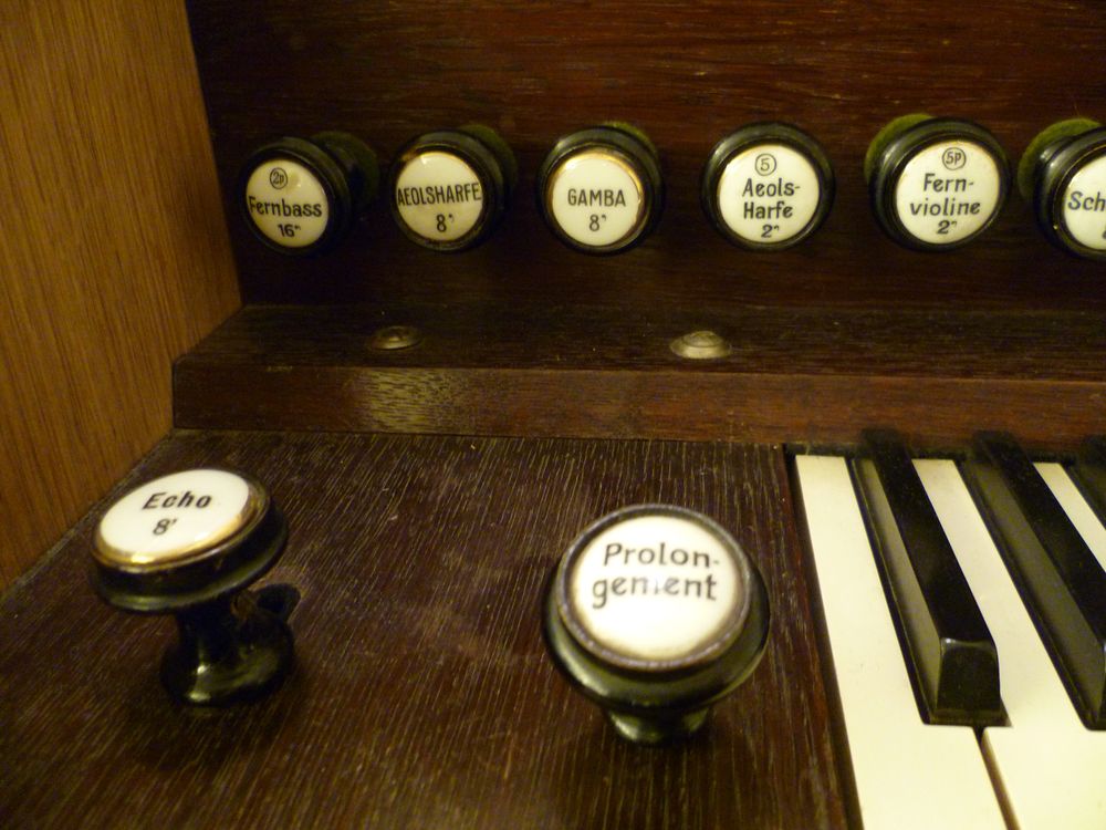 BK | Bass-Oberkoppel | DK 1p 1 2 3 4 - 5 5p 6 7 8 9 10 11 | Diskant-Koppel Hohlflöte 8' Melodia 8' Fagott 16' Musette 16' Flöte 4' Bifara 16' + 4' Schalmei 8' Oboe 8' Voix Celeste 16' Vox Celestis 8' Baryton 32' Salicional 8' Aeolsharfe 8' Piccolo 2' Vibrator [Diskant] |